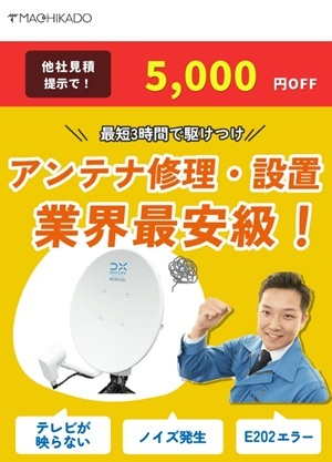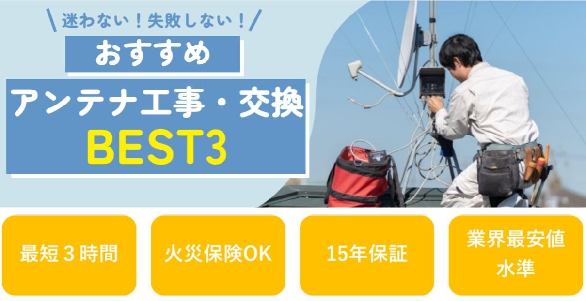そこで今回は、最短3時間以内に駆けつけてくれて業界最安値水準、即日交換対応、15年保証が付くオトクでその日のうちにテレビが見れるスピード対応なアンテナ工事専門業者をご紹介します。
