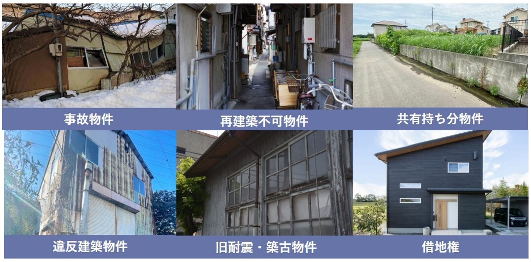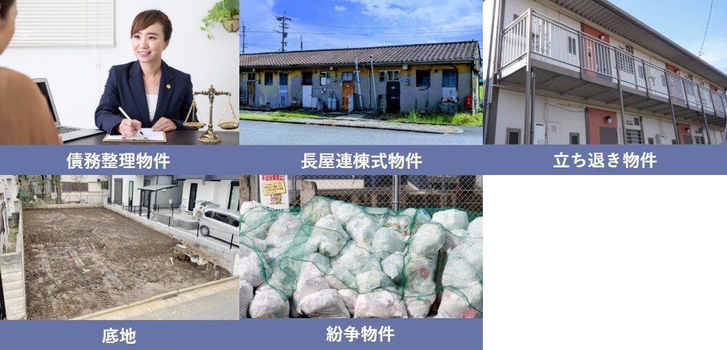 訳あり物件全般、事故、事件、再建築不可、共有持分、違反建築、旧耐震、築古、借地権、債務整理物件、長屋連投式、立ち退き、底地、紛争物件、ゴミ屋敷、雨漏り、シロアリ、廃墟、近隣トラブル、火事など |